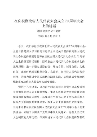 / 领导讲话:20240929在庆祝湖北省人民代表大会成立70周年大会上的讲话——湖北省委书记王蒙徽