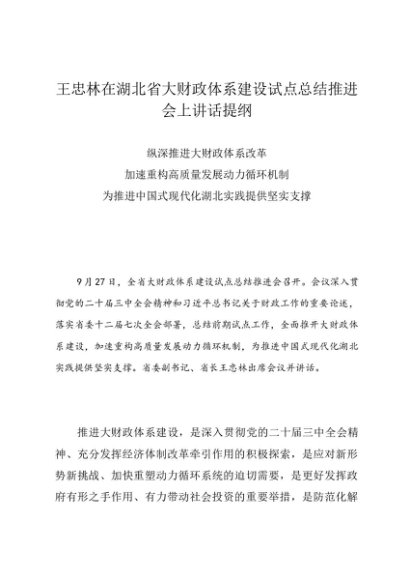 / 领导讲话:20240927王忠林在湖北省大财政体系建设试点总结推进会上讲话提纲