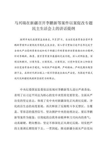 / 领导讲话:20240927马兴瑞在新疆召开李鹏新等案件以案促改专题民主生活会上的讲话提纲