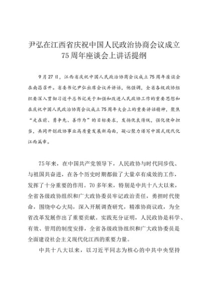 / 领导讲话:20240927尹弘在江西省庆祝中国人民政治协商会议成立75周年座谈会上讲话提纲