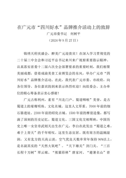 / 领导讲话:20240927在广元市“四川好水”品牌推介活动上的致辞——广元市委书记 何树平