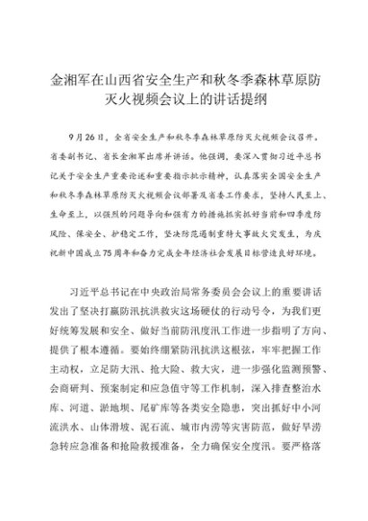 / 领导讲话:20240926金湘军在山西省安全生产和秋冬季森林草原防灭火视频会议上的讲话提纲