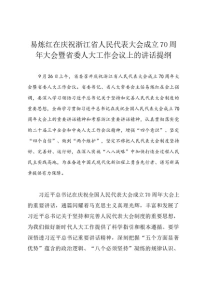 / 领导讲话:20240926易炼红在庆祝浙江省人民代表大会成立70周年大会暨省委人大工作会议上的讲话提纲