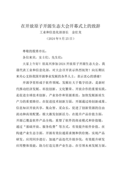 / 领导讲话:20240925在开放原子开源生态大会开幕式上的致辞——工业和信息化部部长 金壮龙
