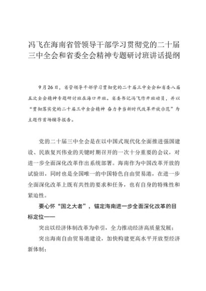 / 领导讲话:20240926冯飞在海南省管领导干部学习贯彻党的二十届三中全会和省委全会精神专题研讨班讲话提纲