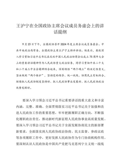 / 领导讲话:20240923王沪宁在全国政协主席会议成员务虚会上的讲话提纲