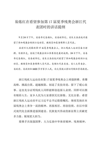 领导讲话:20240924易炼红在看望参加第17届夏季残奥会浙江代表团时的讲话提纲