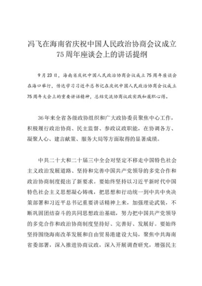 / 领导讲话:20240923冯飞在海南省庆祝中国人民政治协商会议成立75周年座谈会上的讲话提纲