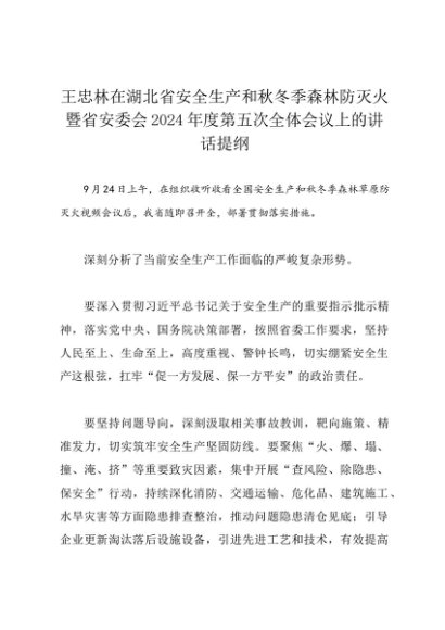 领导讲话:20240924王忠林在湖北省安全生产和秋冬季森林防灭火暨省安委会2024年度第五次全体会议上的讲话提纲