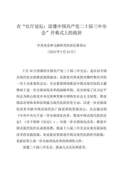 / 领导讲话:20240924在“红厅论坛:读懂中国共产党二十届三中全会”开幕式上的致辞——中央党史和文献研究院院长曲青山