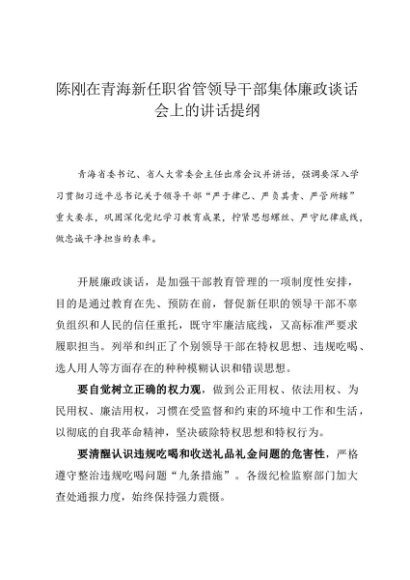 / 领导讲话:20240920陈刚在青海新任职省管领导干部集体廉政谈话会上的讲话提纲