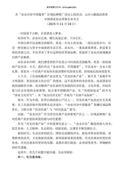 / 领导讲话:20251130中国酒业协会理事长宋书玉:在“赤水河谷中国酱香”区域品牌推广活动上的讲话:山河入酿成此酒香