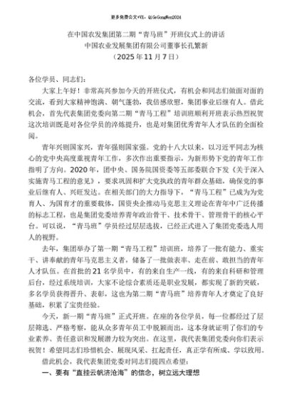 / 领导讲话:20251130中国农业发展集团有限公司董事长孔繁新:在中国农发集团第二期“青马班”开班仪式上的讲话