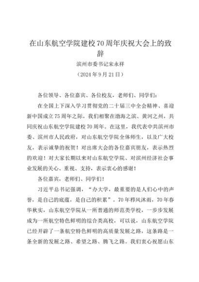 / 领导讲话:20240921在山东航空学院建校70周年庆祝大会上的致辞——滨州市委书记宋永祥