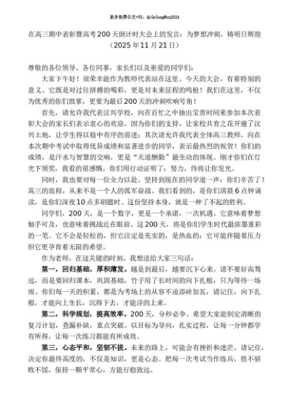 / 领导讲话:20251130在高三期中表彰暨高考200天倒计时大会上的发言:为梦想冲刺,铸明日辉煌
