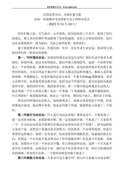 / 领导讲话:20251130在高一年级期中考试表彰大会上的即兴发言:以四论明方向,为成长蓄力量