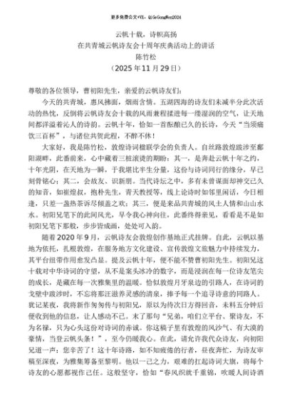 / 领导讲话:20251130在共青城云帆诗友会十周年庆典活动上的讲话:云帆十载,诗帜高扬