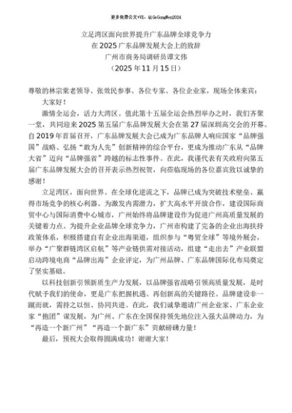/ 领导讲话:20251130在2025广东品牌发展大会上的致辞:立足湾区面向世界提升广东品牌全球竞争力