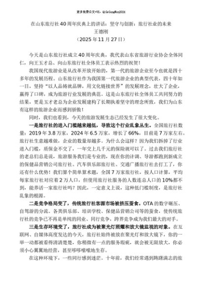 / 领导讲话:20251130王德刚:在山东旅行社40周年庆典上的讲话:坚守与创新:旅行社业的未来