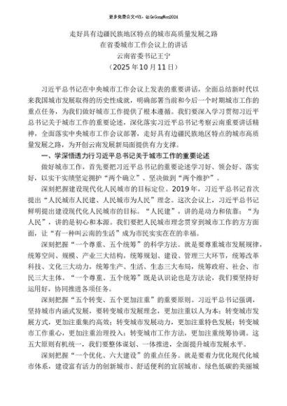 / 领导讲话:20251130云南省委书记王宁:在省委城市工作会议上的讲话