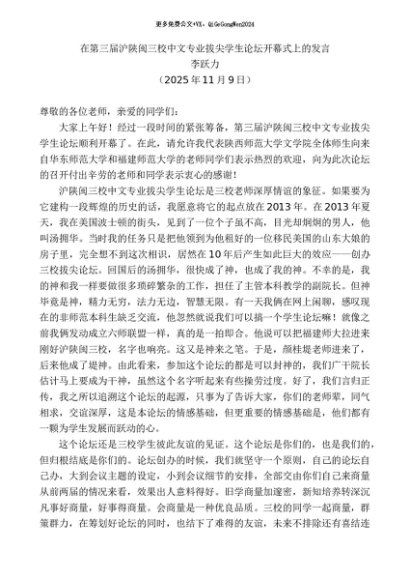 / 领导讲话:20251130李跃力:在第三届沪陕闽三校中文专业拔尖学生论坛开幕式上的发言