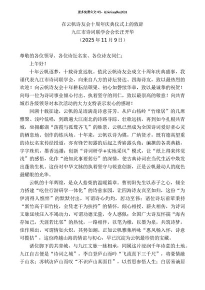 / 领导讲话:20251130九江市诗词联学会会长汪开华:在云帆诗友会十周年庆典仪式上的致辞