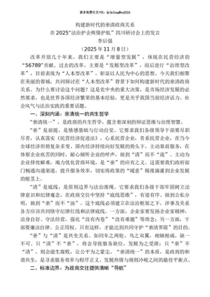/ 领导讲话:20251130李后强:在2025“法治护企舆情护航”四川研讨会上的发言:构建新时代的亲清政商关系