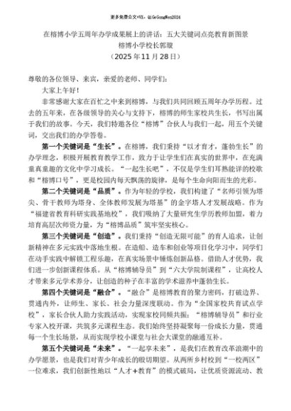 / 领导讲话:20251130榕博小学校长郭璇:在榕博小学五周年办学成果展上的讲话:五大关键词点亮教育新图景