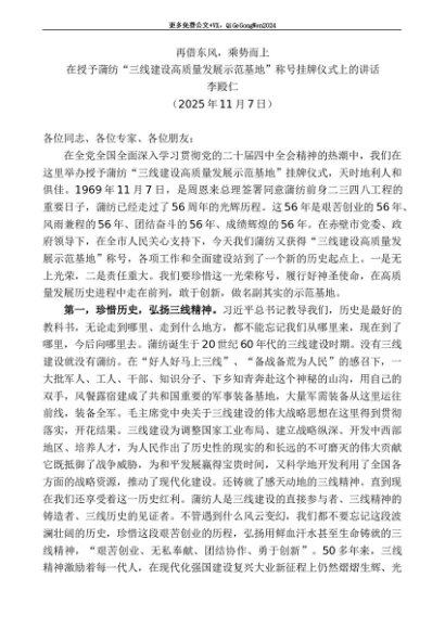 / 领导讲话:20251130李殿仁:在授予蒲纺“三线建设高质量发展示范基地”称号挂牌仪式上的讲话