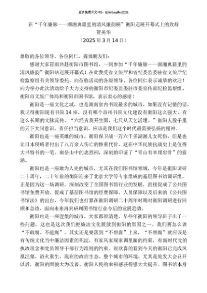 / 领导讲话:20251130贺美华:在“千年廉脉——湖湘典籍里的清风廉韵展”衡阳巡展开幕式上的致辞