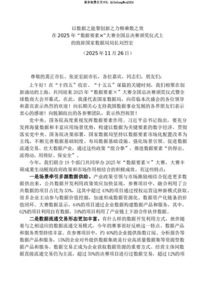 / 领导讲话:20251126在2025年“数据要素×”大赛全国总决赛颁奖仪式上的致辞——国家数据局局长刘烈宏