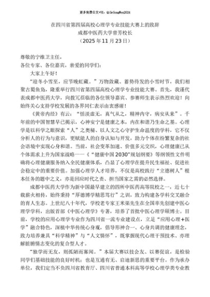 / 领导讲话:20251130成都中医药大学曾芳校长:在四川省第四届高校心理学专业技能大赛上的致辞