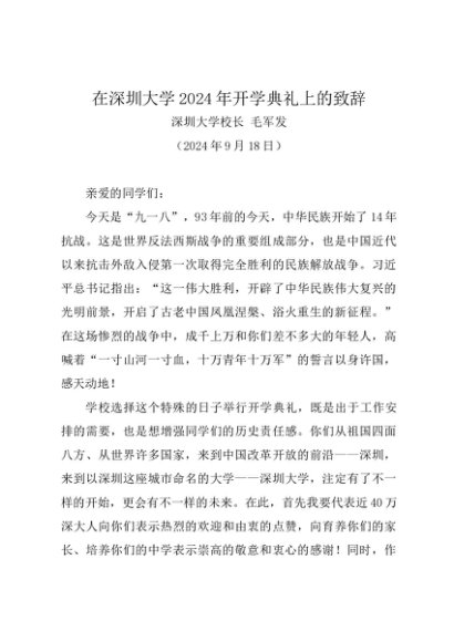 / 领导讲话:20240918在深圳大学2024年开学典礼上的致辞——深圳大学校长 毛军发
