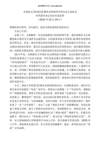 / 领导讲话:20251115时代报告杂志社社长张富领:在奔流文学院第23期作家研修班开班仪式上的讲话