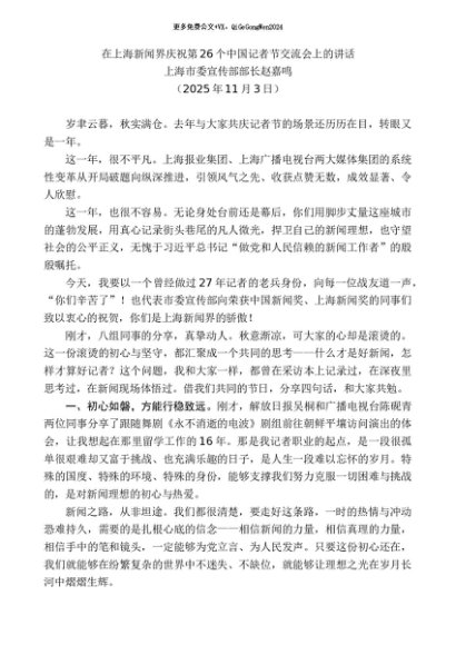 / 领导讲话:20251115上海市委宣传部部长赵嘉鸣:在上海新闻界庆祝第26个中国记者节交流会上的讲话