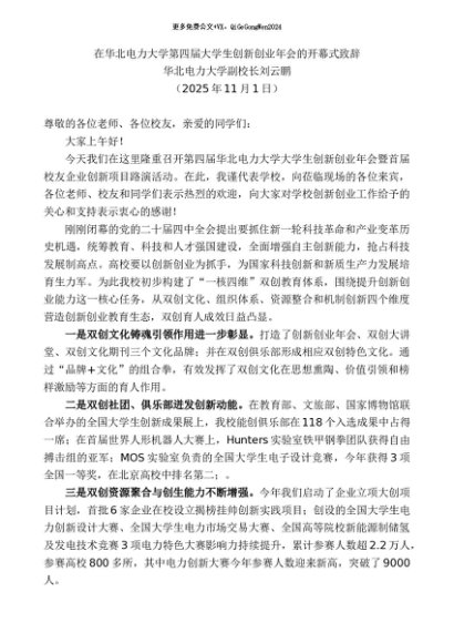 / 领导讲话:20251115华北电力大学副校长刘云鹏:在华北电力大学第四届大学生创新创业年会的开幕式致辞