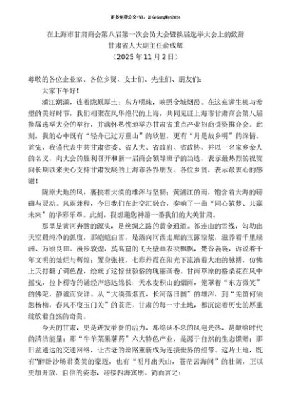 / 领导讲话:20251115甘肃省人大副主任俞成辉:在上海市甘肃商会第八届第一次会员大会暨换届选举大会上的致辞