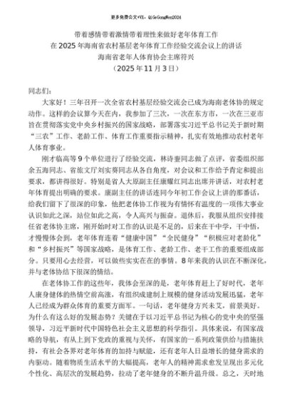 / 领导讲话:20251115海南省老年人体育协会主席符兴:在2025年海南省农村基层老年体育工作经验交流会议上的讲话
