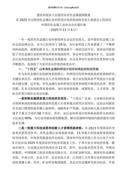 / 领导讲话:20251115中国葛红林:在2025年全国有色金属行业科研设计院所和高校负责人座谈会上的讲话