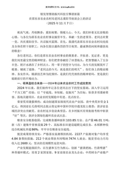 / 领导讲话:20251115在邵东市农业农村局老同志重阳节座谈会上的讲话:银发智慧助振兴科技引擎谱新篇
