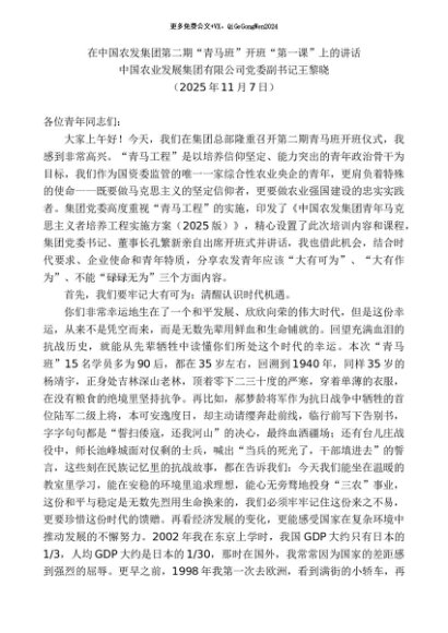 / 领导讲话:20251115中国农业发展集团有限公司党委副书记王黎晓:在中国农发集团第二期“青马班”开班“第一课”上的讲话