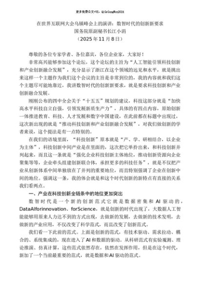 / 领导讲话:20251115国务院原副秘书长江小涓:在世界互联网大会乌镇峰会上的演讲:数智时代的创新新要求