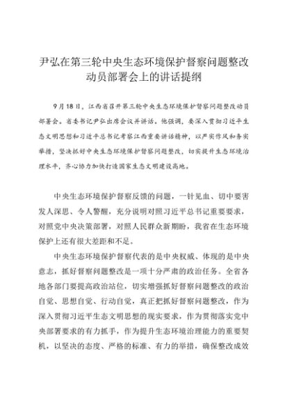/ 领导讲话:20240918尹弘在江西省第三轮中央生态环境保护督察问题整改动员部署会上的讲话提纲