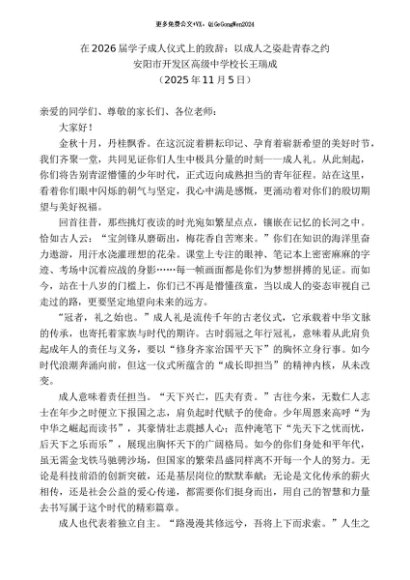 / 领导讲话:20251115安阳市开发区高级中学校长王瑞成:在2026届学子成人仪式上的致辞