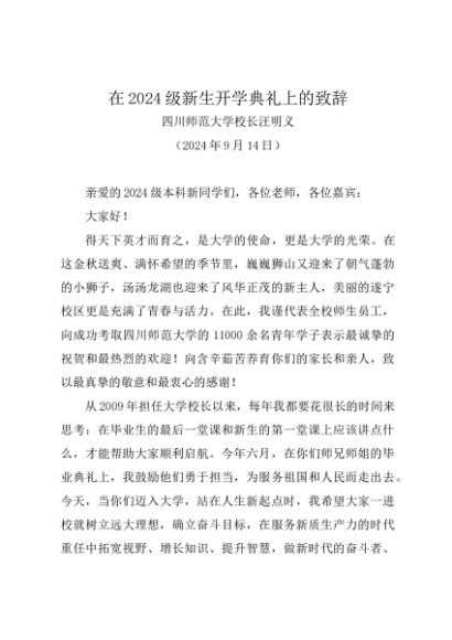 / 领导讲话:20240914在2024级新生开学典礼上的致辞——四川师范大学校长汪明义