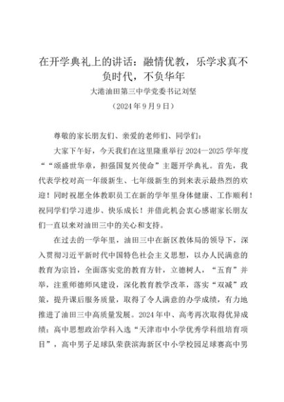 领导讲话:20240909在开学典礼上的讲话:融情优教,乐学求真不负时代,不负华年——大港油田第三中学党委书记刘坚docx