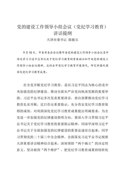 / 领导讲话:20240910党的建设工作领导小组会议(党纪学习教育)讲话提纲——天津市委书记 陈敏尔