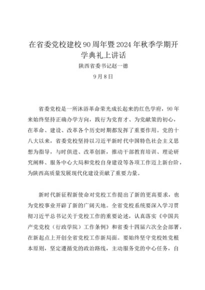 / 领导讲话:20240908省委党校建校90周年暨2024年秋季学期开学典礼讲话提纲——陕西省委书记赵一德