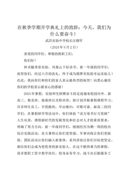 / 领导讲话:20240903在秋季学期开学典礼上的致辞:今天,我们为什么要奋斗——武昌实验中学校长汪拥军