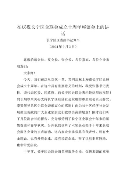 / 领导讲话:20240903在庆祝长宁区企联会成立十周年座谈会上的讲话——长宁区区委副书记刘平